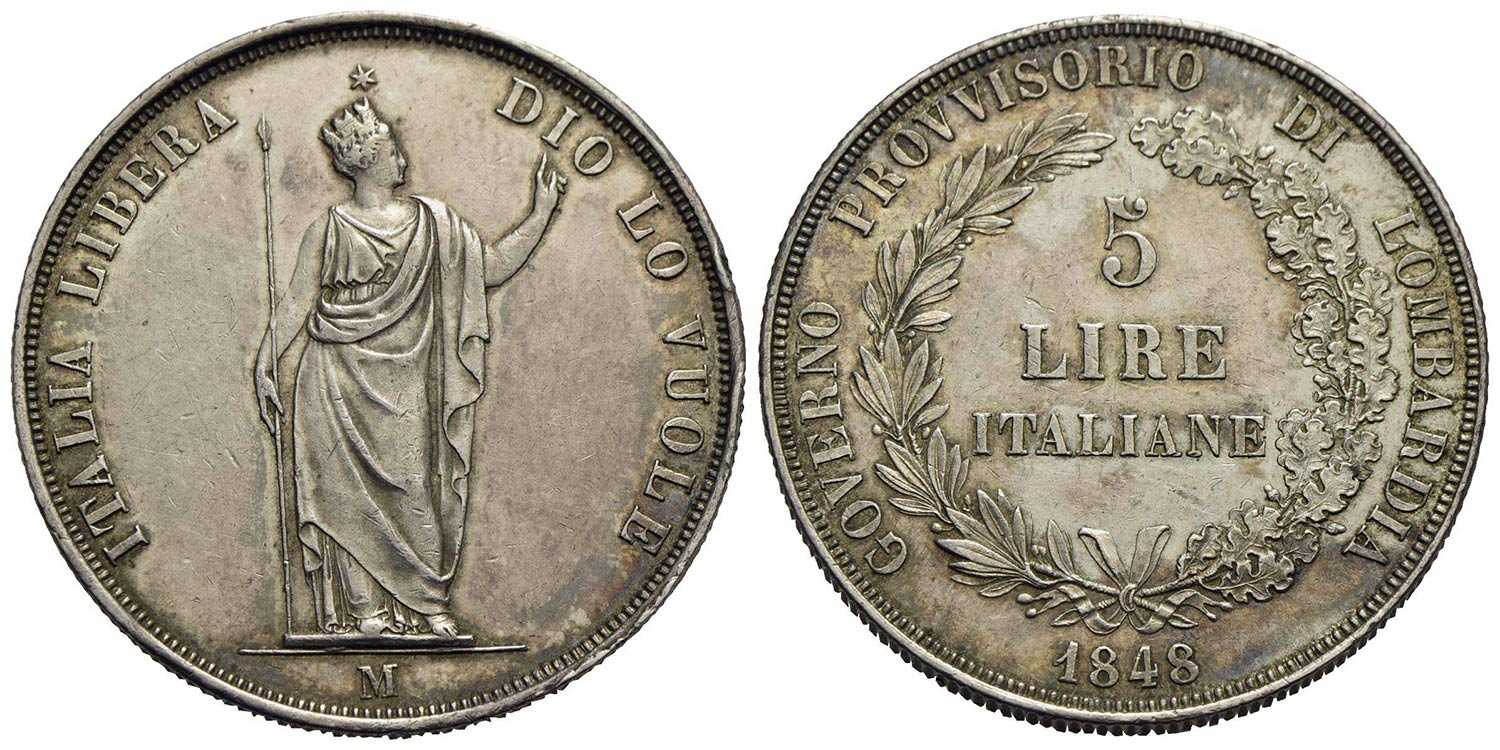MILANO - Governo Provvisorio (1848) - 5 Lire - 1848 - AG R Pag. 213a; Mont. 426 Base più spessa e st