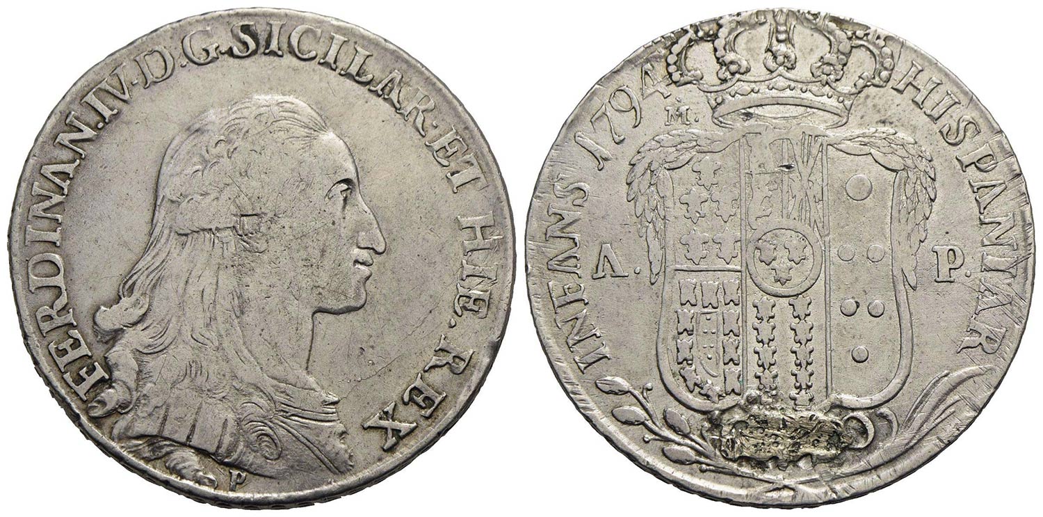 NAPOLI - Ferdinando IV di Borbone (primo periodo, 1759-1799) - Piastra - 1794 - AG Mont. 212 SICILAR
