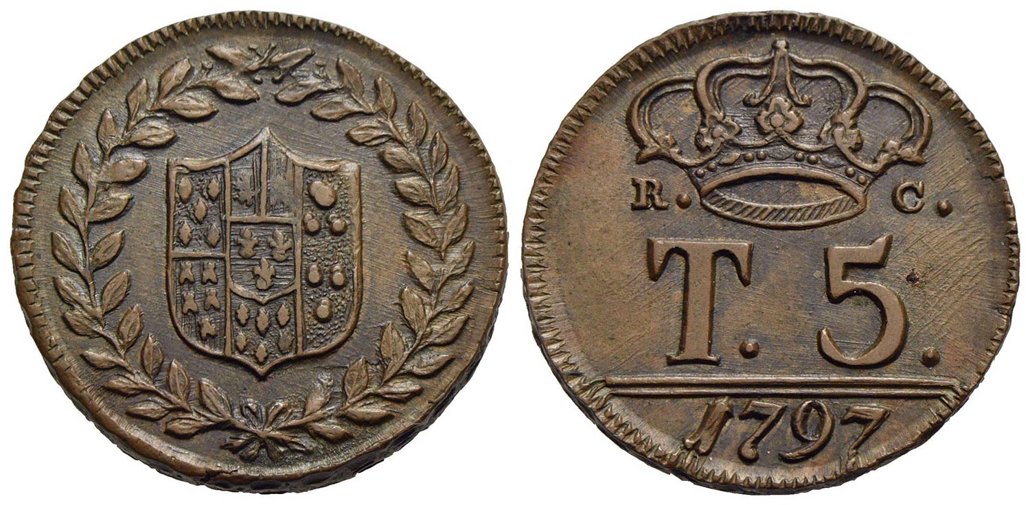 NAPOLI - Ferdinando IV di Borbone (primo periodo, 1759-1799) - 5 Tornesi - 1797 - CU RR Mont. 265 Senza la P Conservazione eccezionale per il tipo - Sicuramente il migliore esemplare che ci sia capitato di osservare
