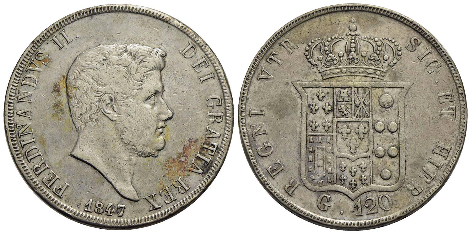 NAPOLI - Ferdinando II di Borbone (1830-1859) - Piastra - 1847 - AG P.R. 72; Mont. 775/776 Con cartellino del collezionista anni '50-'60