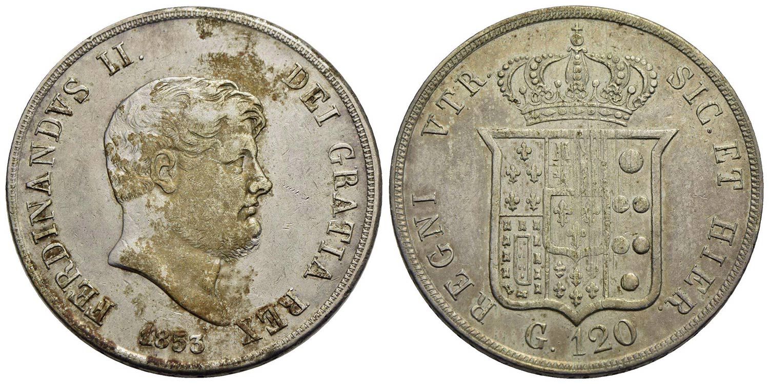 Lotto 1304 | NAPOLI - Ferdinando II di Borbone (1830-1859) - Piastra - 1853 - AG P.R. 82; Mont. 796/797 Con carte