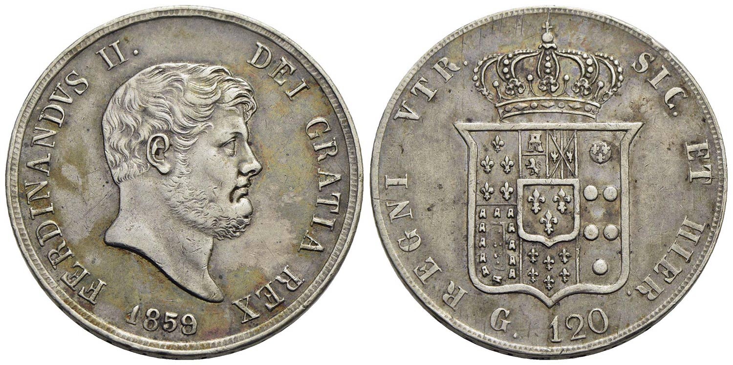 NAPOLI - Ferdinando II di Borbone (1830-1859) - Piastra - 1859 - AG R P.R. 88; Mont. 822/825 Con cartellino del collezionista anni '50-'60