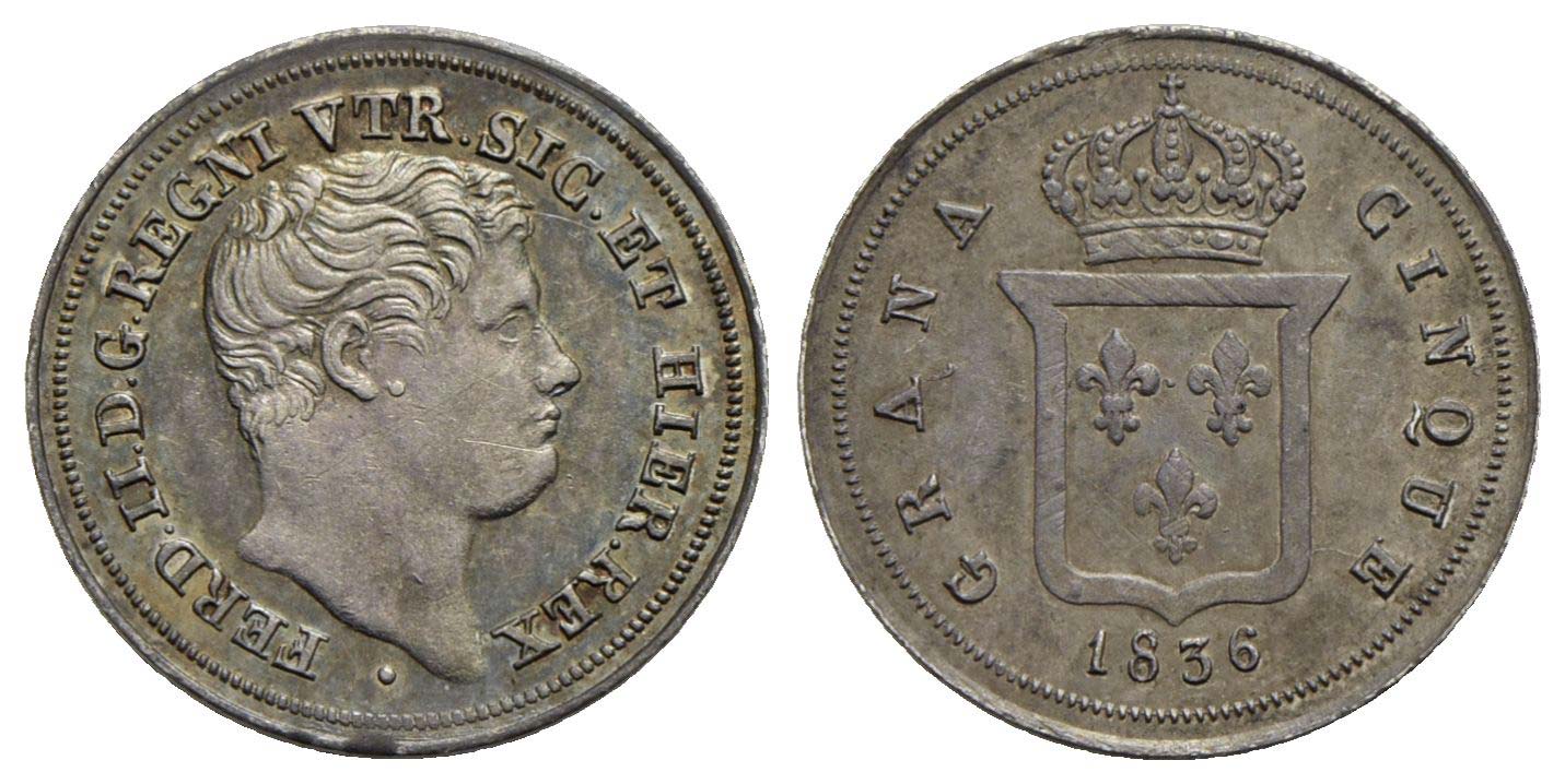 NAPOLI - Ferdinando II di Borbone (1830-1859) - 5 Grana - 1836 - AG P.R. 171; Mont. 963/964<br>SPL-F