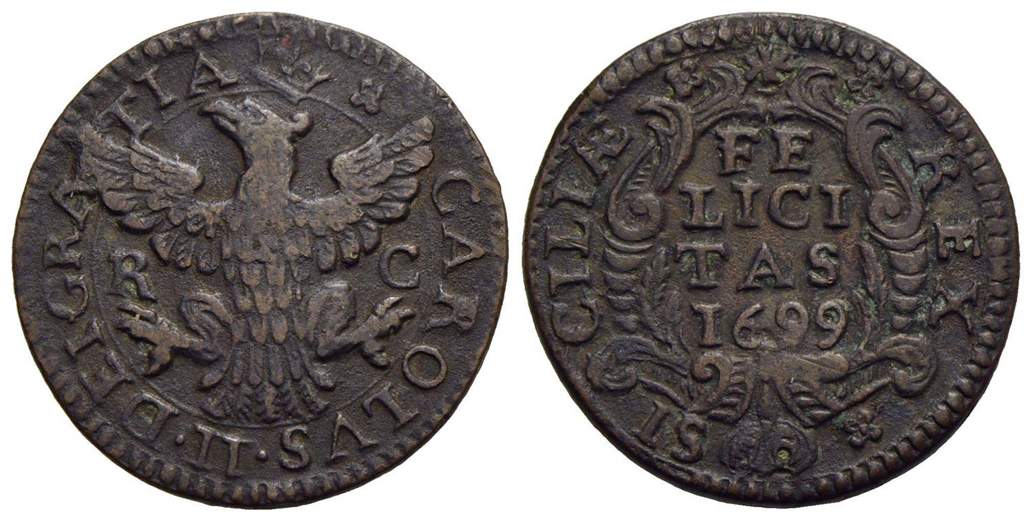 PALERMO - Carlo II (1674-1700) - Grano - 1699 - Aquila coronata volta a s. - R/ Scritta e data entro ornato - CU Spahr 83; MIR 497/2 Con cartellino del collezionista anni '50-'60