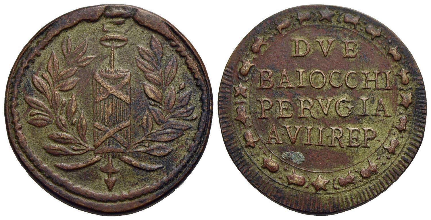 PERUGIA - Repubblica Romana (1798-1799) - 2 Baiocchi - Fascio littorio con scure e pileo a d. - R/ S