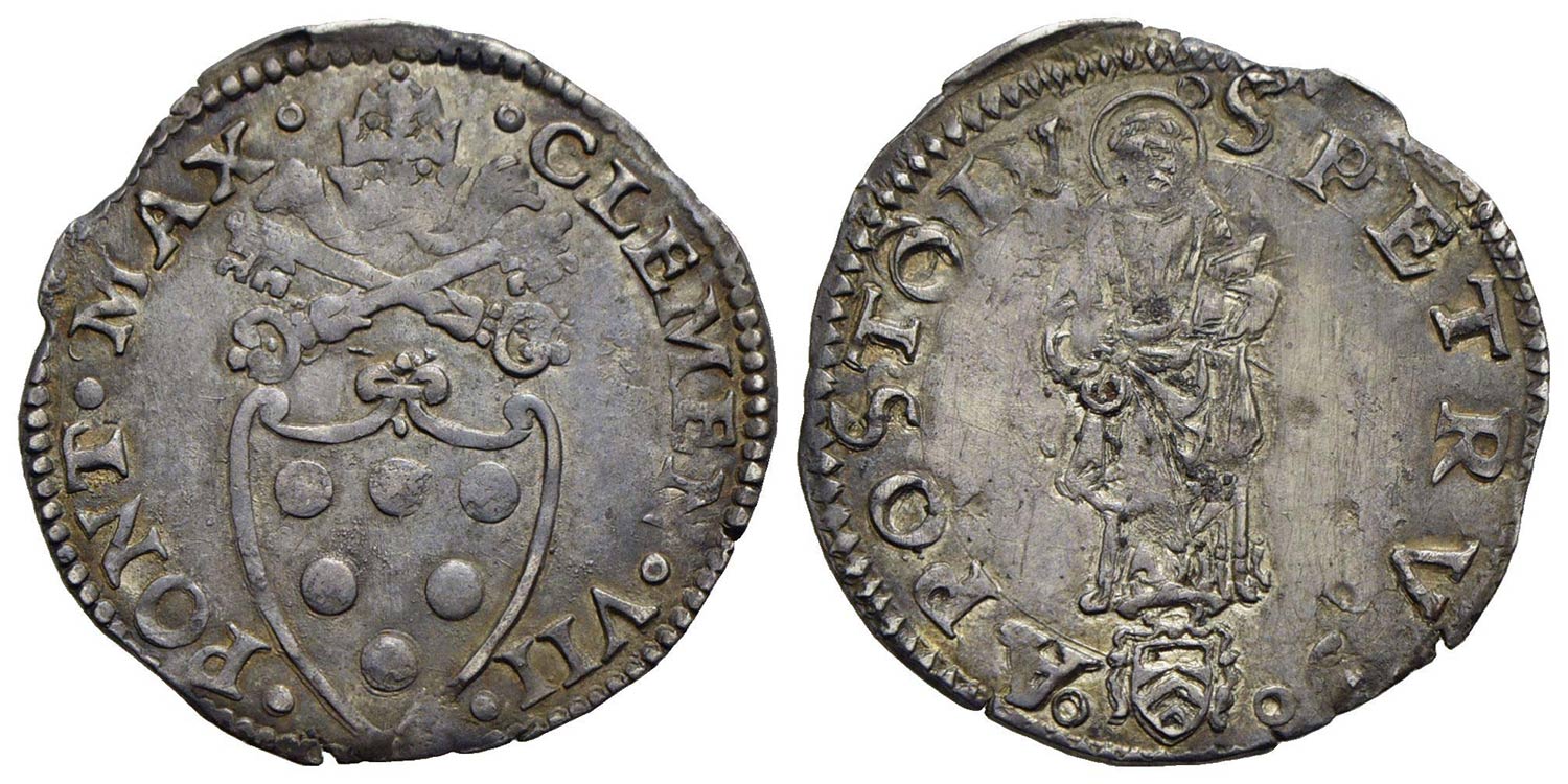 ROMA - Clemente VII (1523-1534) - Mezzo giulio - Stemma semiovale gigliato - R/ Figura del santo e sotto stemma Armellini - (AG g. 1,83) R CNI 108; Munt. 65