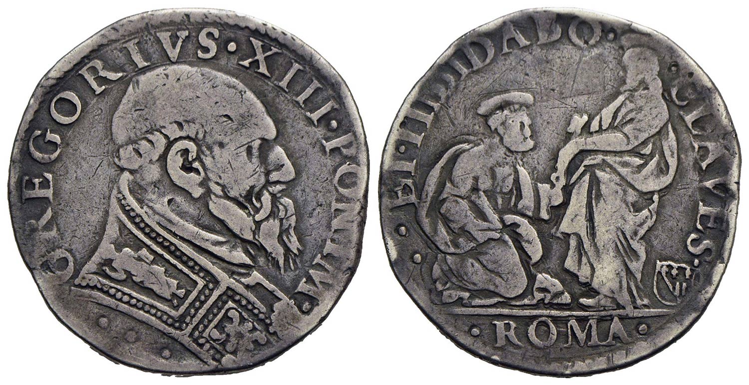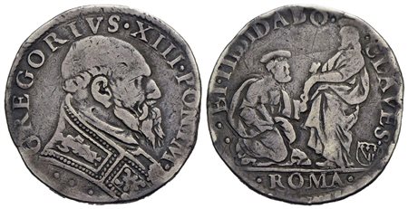 ROMA - Gregorio XIII (1572-1585) - Testone - Stemma e chiavi - R/ Gesù consegna le chiavi a San Piet