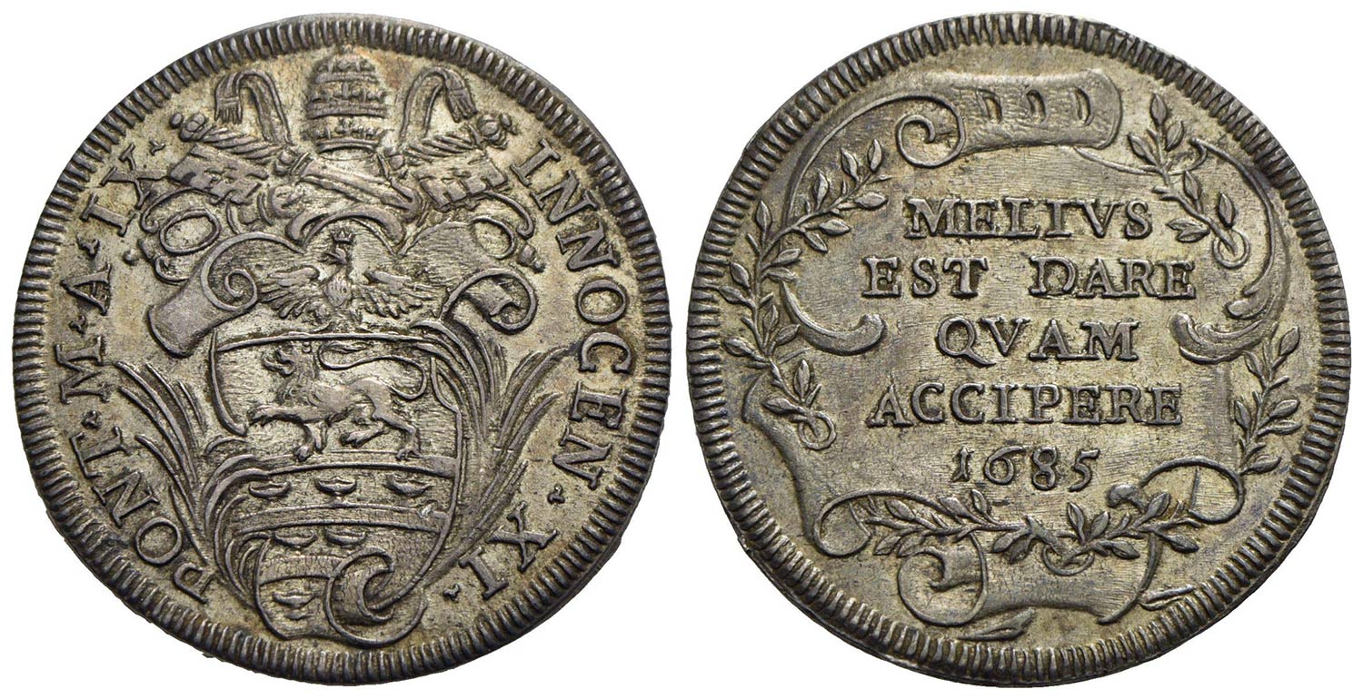 ROMA - Innocenzo XI (1676-1689) - Testone - 1685 A. IX - Stemma sagomato con punta a s. tra due rami di palma - R/ Scritta in cinque righe in cartella a volute entro corona d'alloro - AG CNI 96; Munt. 90