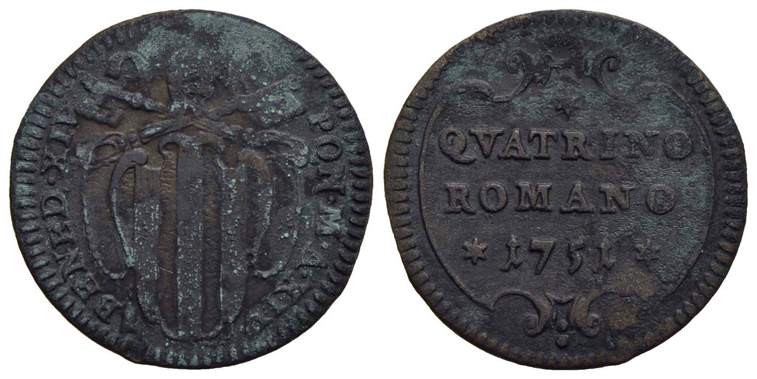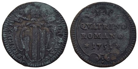 ROMA - Benedetto XIV (1740-1758) - Quattrino - 1751 A. XII - Stemma ovale sagomato - R/ Scritta in cartella tonda - CU CNI 295; Munt. 213