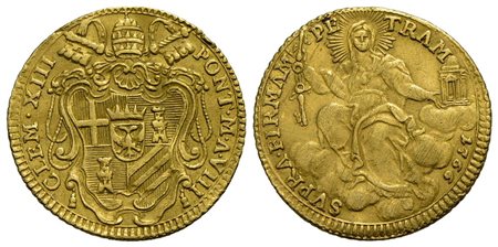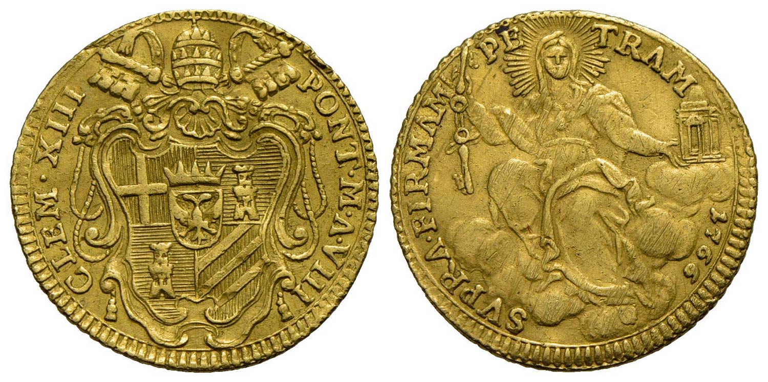 ROMA - Clemente XIII (1758-1769) - Zecchino - 1766 A. VIII - Stemma a targa sagomata - R/ La Chiesa seduta sulle nubi - AU CNI 66; Munt. 7 Con cartellino manoscritto del collezionista anni '60