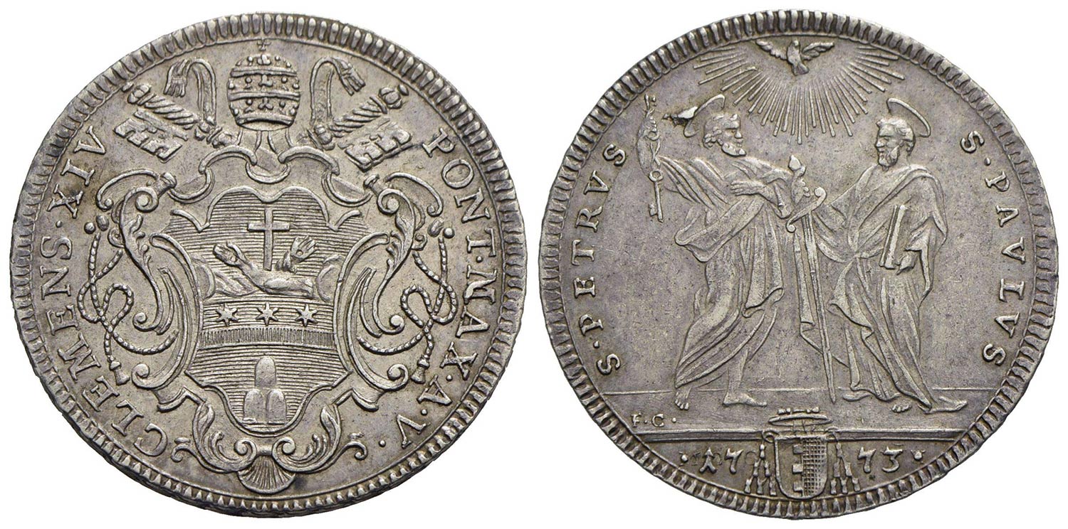ROMA - Clemente XIV (1769-1774) - Testone - 1773 A. V - Stemma a targa sagomata - R/ San Paolo e San