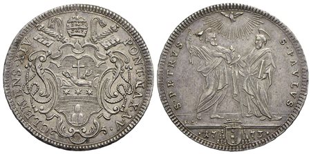 ROMA - Clemente XIV (1769-1774) - Testone - 1773 A. V - Stemma a targa sagomata - R/ San Paolo e San Pietro affrontati - AG CNI manca; Munt. 5