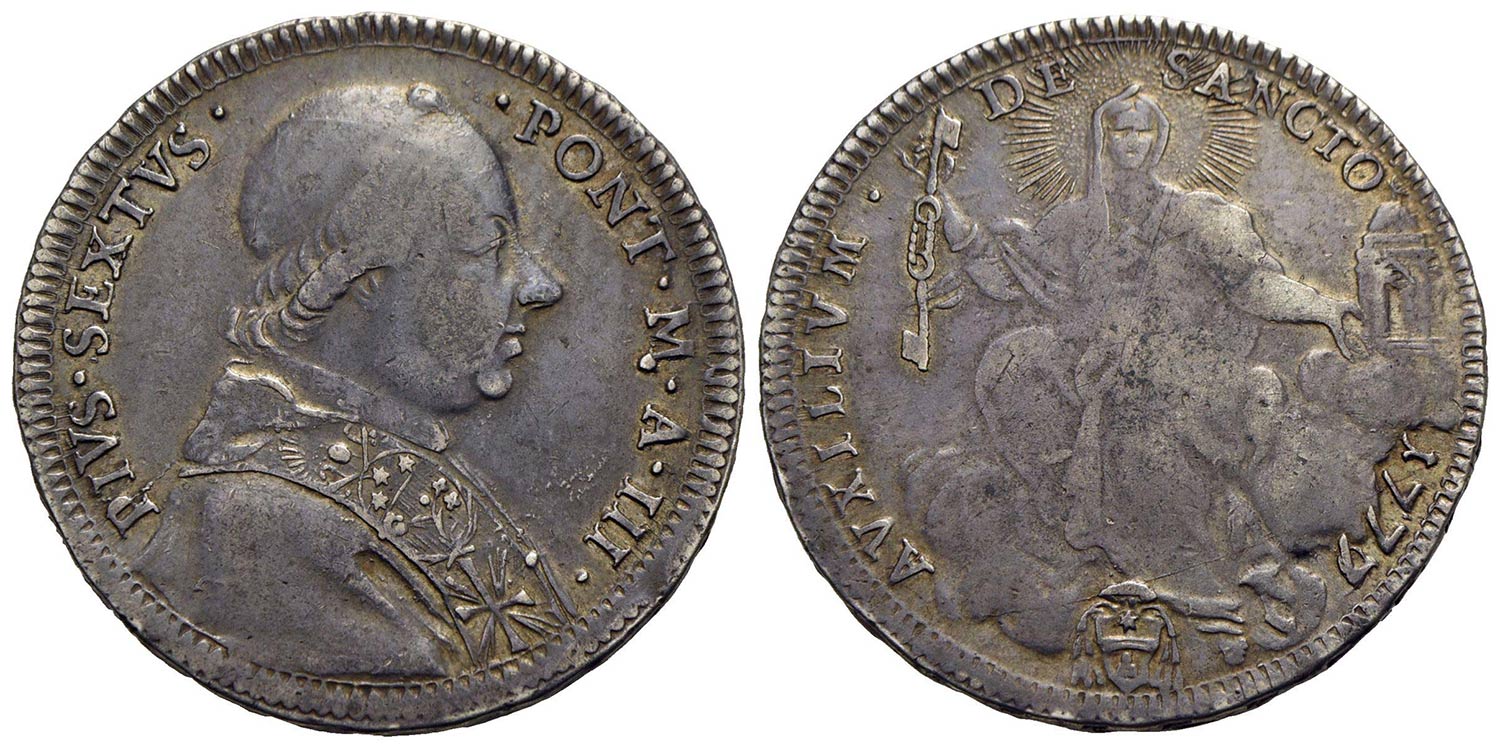 Lotto 1492 | ROMA - Pio VI (1775-1799) - Mezzo scudo romano - 1777 A. III - AG R CNI 28; Munt. 23<br>BB