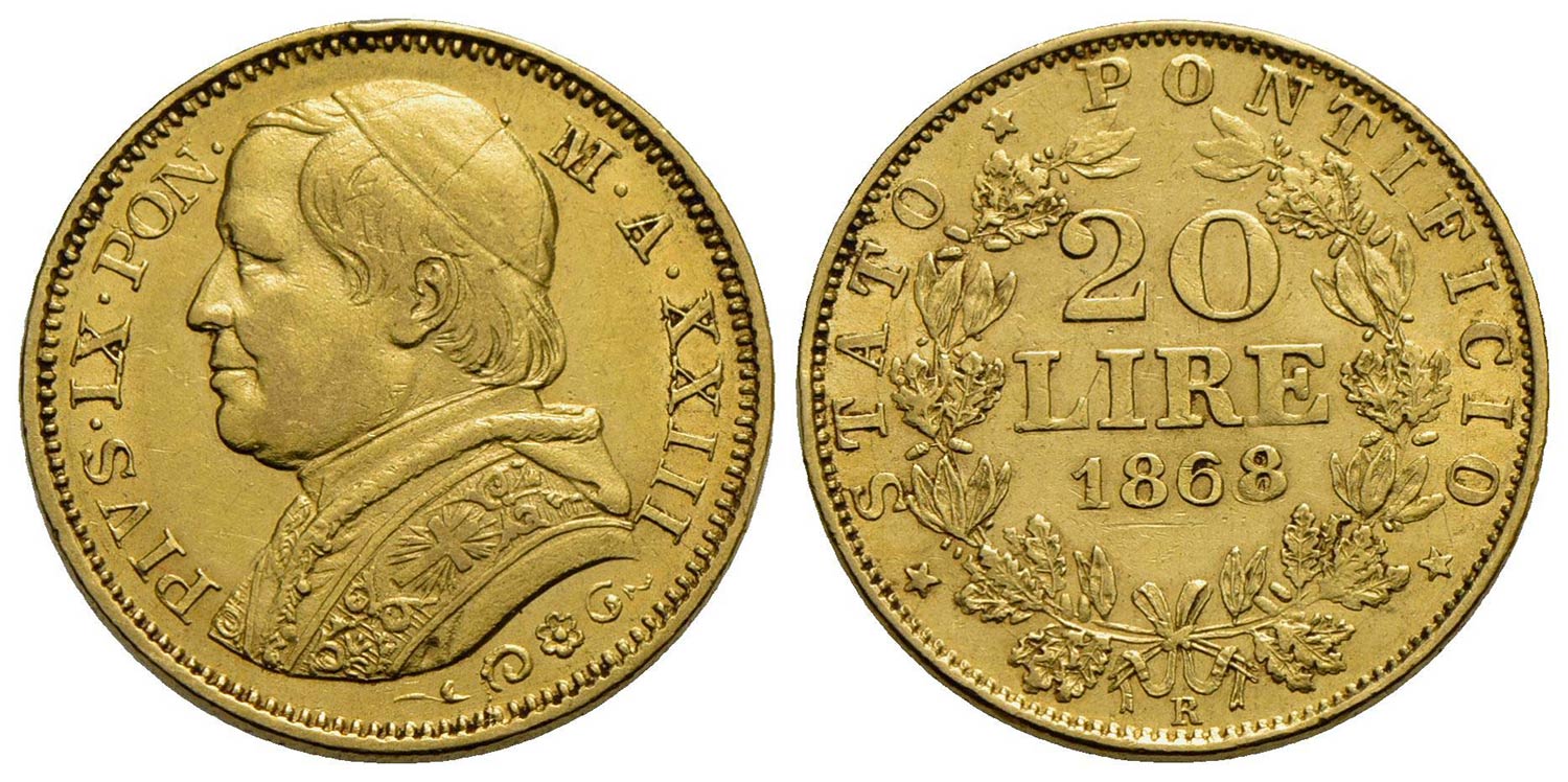 Lotto 1527 | ROMA - Pio IX (1866-1878) - 20 Lire - 1868 A. XXIII - AU RRR Pag. 534; Mont. 350 Il secondo 8 è riba