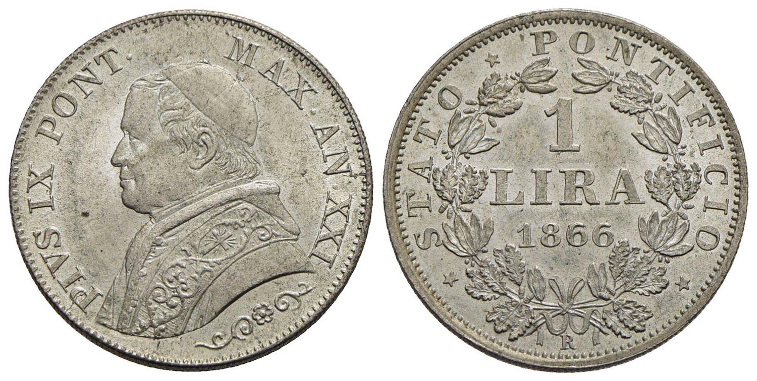 ROMA - Pio IX (1866-1878) - Lira - 1866 A. XXI - AG R Pag. 566; Mont. 376 Busto piccolo<br>FDC