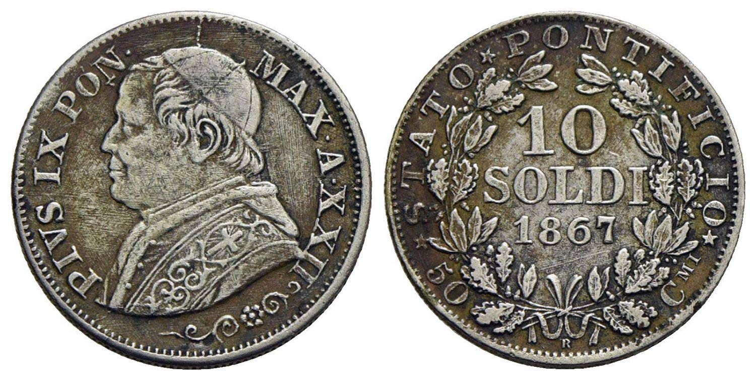 ROMA - Pio IX (1866-1878) - 10 Soldi - 1867 A. XXI - AG Pag. 578; Mont. 387 Bella patina