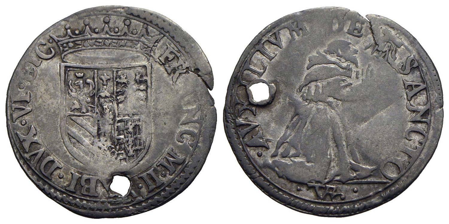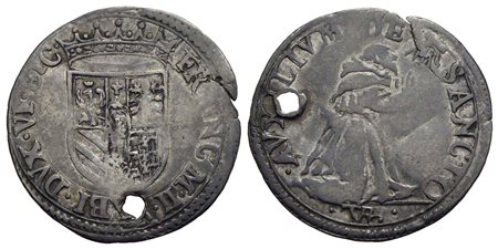 URBINO - Francesco Maria II della Rovere (1574-1624) - Mezzo giulio - Stemma semiovale - R/ San Francesco genuflesso a d. - (AG g. 1,46) RR CNI 140/149 Forato