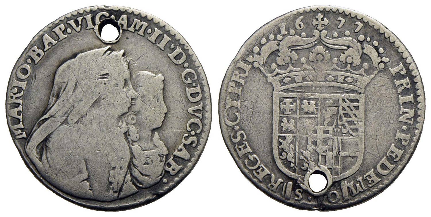 Lotto 1667 | Vittorio Amedeo II (reggenza, 1675-1680) - Mezza lira - 1677 - AG R MIR 839c Forata<br>MB