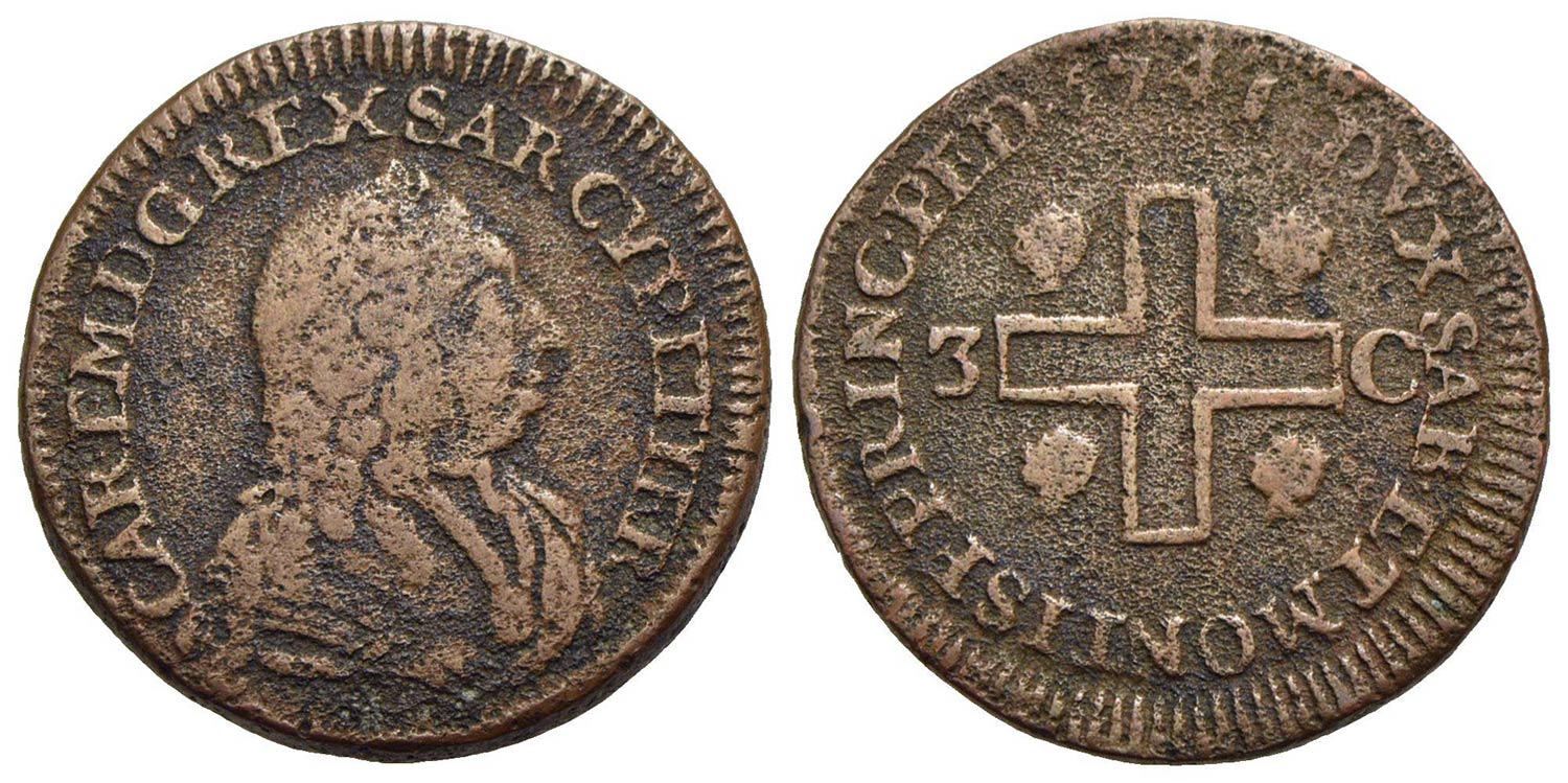 Carlo Emanuele III (1730-1773) - 3 Cagliaresi - 1741 - CU Mont. 110<br>BB/qBB