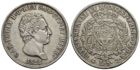 Carlo Felice (1821-1831) - 5 Lire - 1828 G - AG Pag. 74; Mont. 66<br>BB+