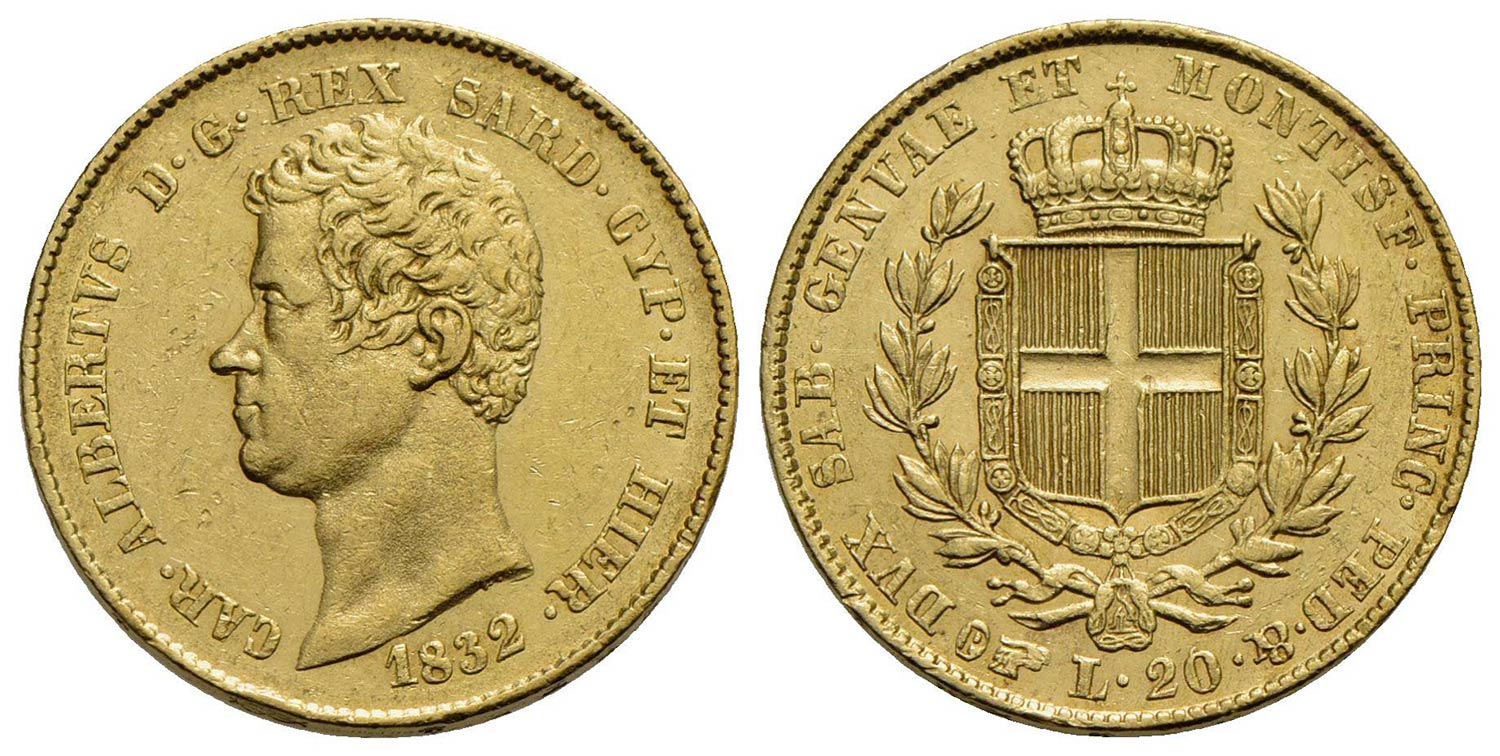 Carlo Alberto (1831-1849) - 20 Lire - 1832 T FERT - AU R Pag. 176a; Mont. 42<br>BB+/SPL