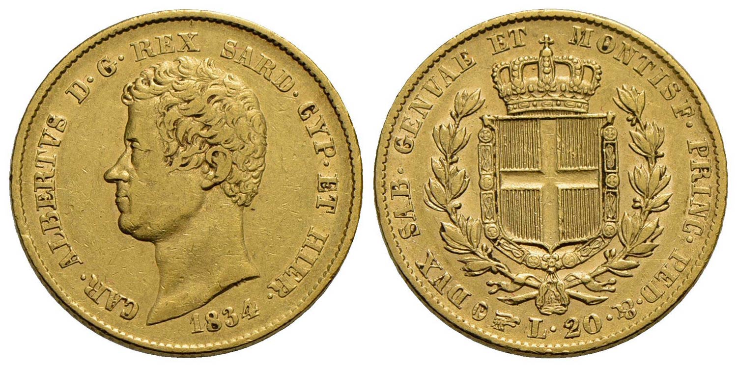 Carlo Alberto (1831-1849) - 20 Lire - 1834 T - AU Pag. 180; Mont. 49<br>BB+/qSPL