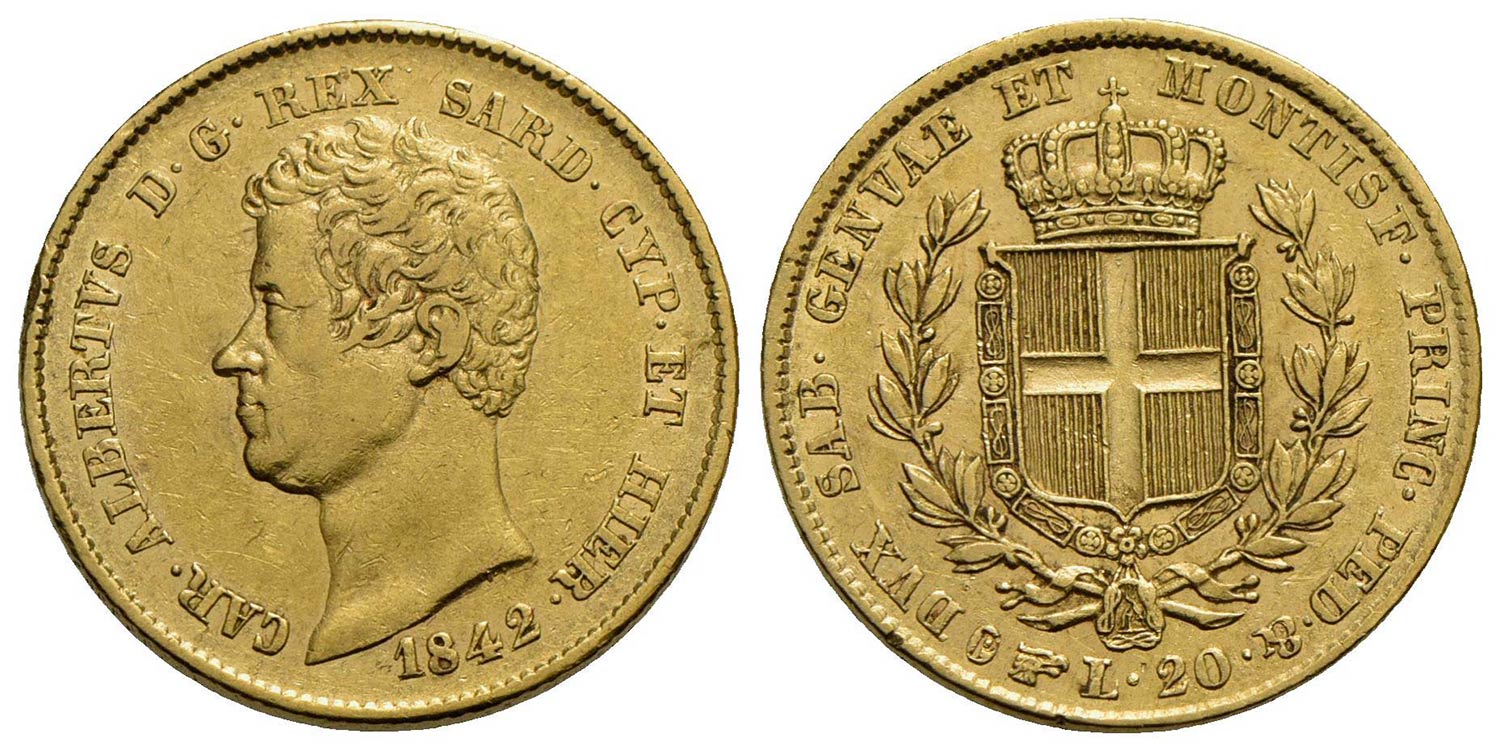 Carlo Alberto (1831-1849) - 20 Lire - 1842 T - AU R Pag. 195; Mont. 65<br>BB+/qSPL