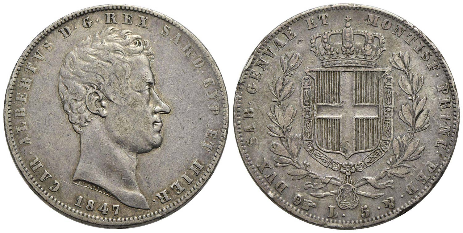 Carlo Alberto (1831-1849) - 5 Lire - 1847 T - AG RR Pag. 262; Mont. 136 Colpetti