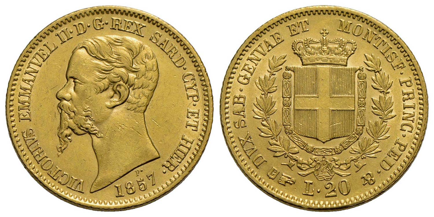 Vittorio Emanuele II (1849-1861) - 20 Lire - 1857 T - AU Pag. 351; Mont. 17 Segnettini<br>SPL/SPL+
