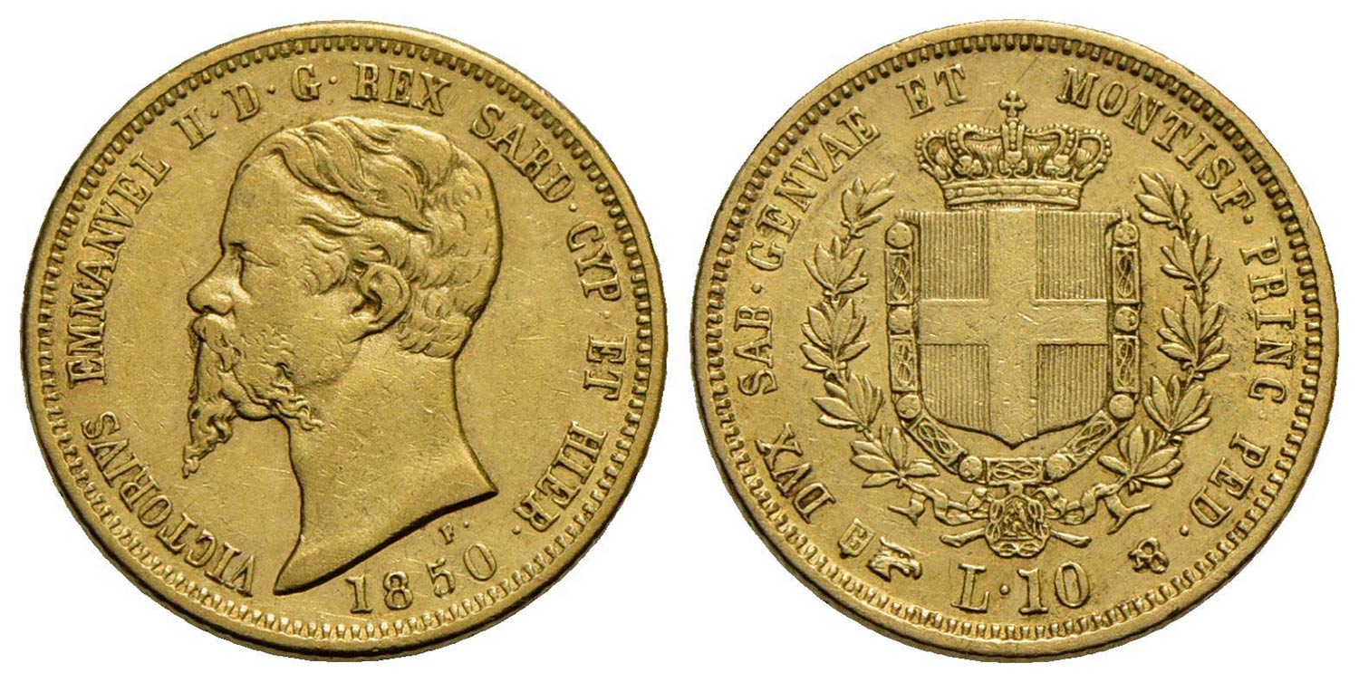 Vittorio Emanuele II (1849-1861) - 10 Lire - 1850 T - AU RR Pag. 361; Mont. 28<br>qBB/BB+