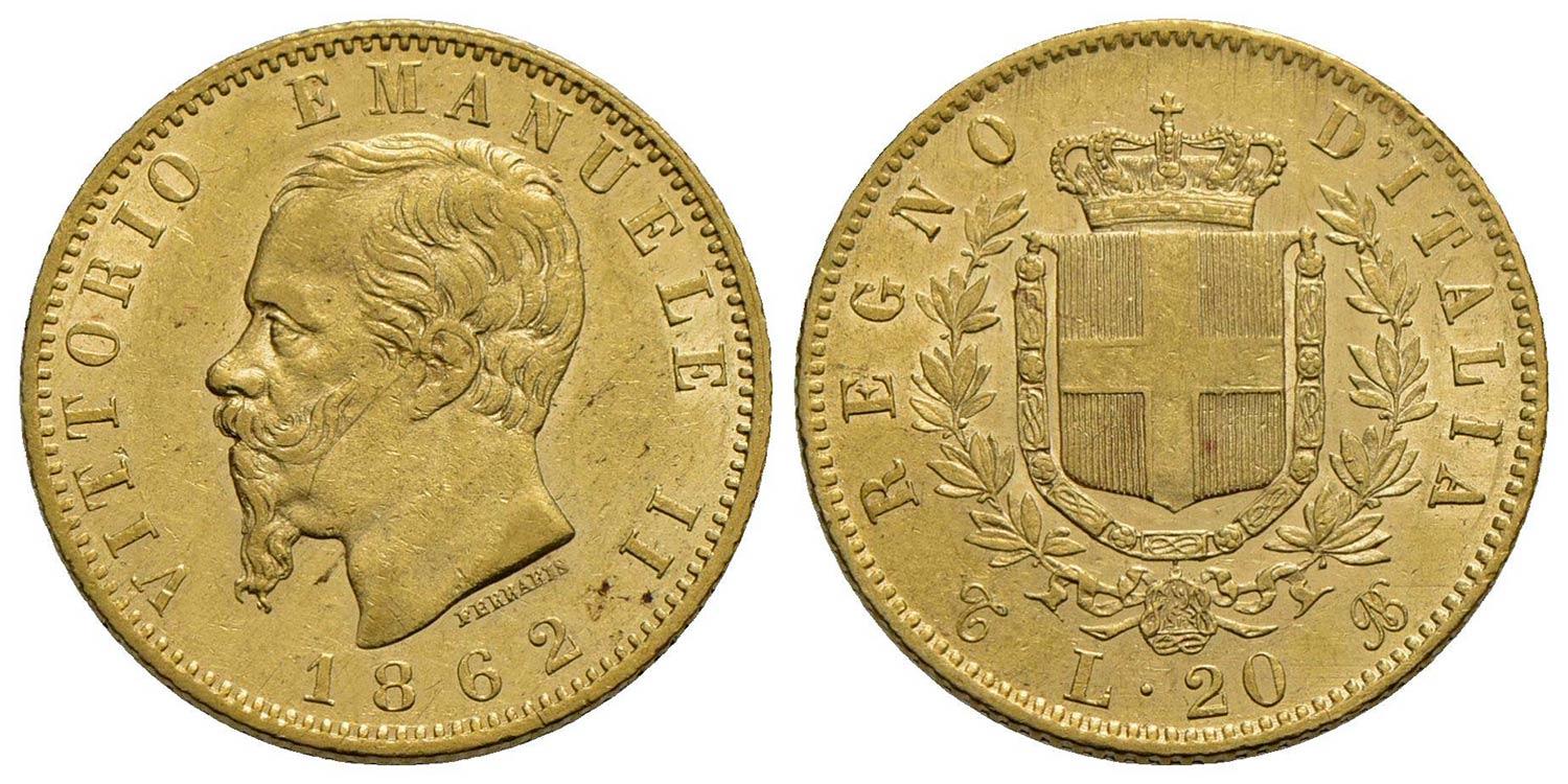Vittorio Emanuele II Re d'Italia (1861-1878) - 20 Lire - 1862 T - AU Pag. 456; Mont. 132<br>SPL+/qFD