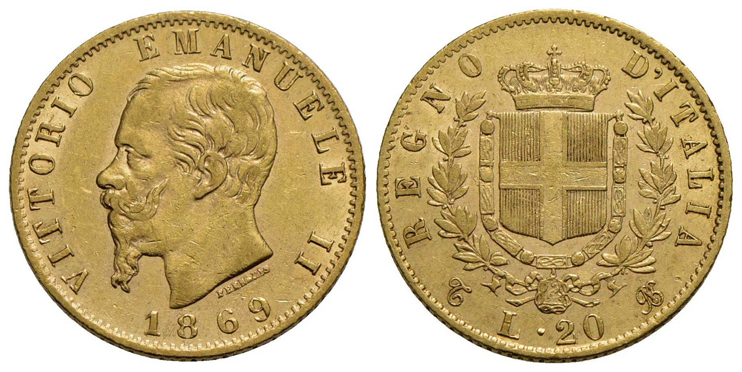 Vittorio Emanuele II Re d'Italia (1861-1878) - 20 Lire - 1869 T - AU Pag. 463; Mont. 139<br>BB+