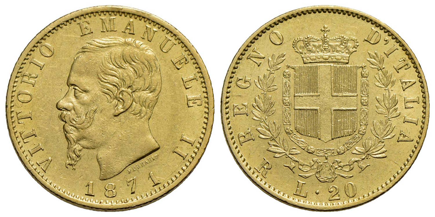 Vittorio Emanuele II Re d'Italia (1861-1878) - 20 Lire - 1871 R - AU R Pag. 466; Mont. 142<br>SPL-FD