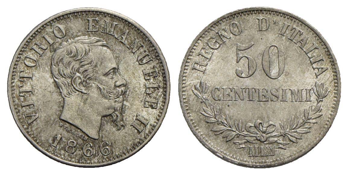 Vittorio Emanuele II Re d'Italia (1861-1878) - 50 Centesimi - 1866 M Valore - AG R Pag. 530; Mont. 2