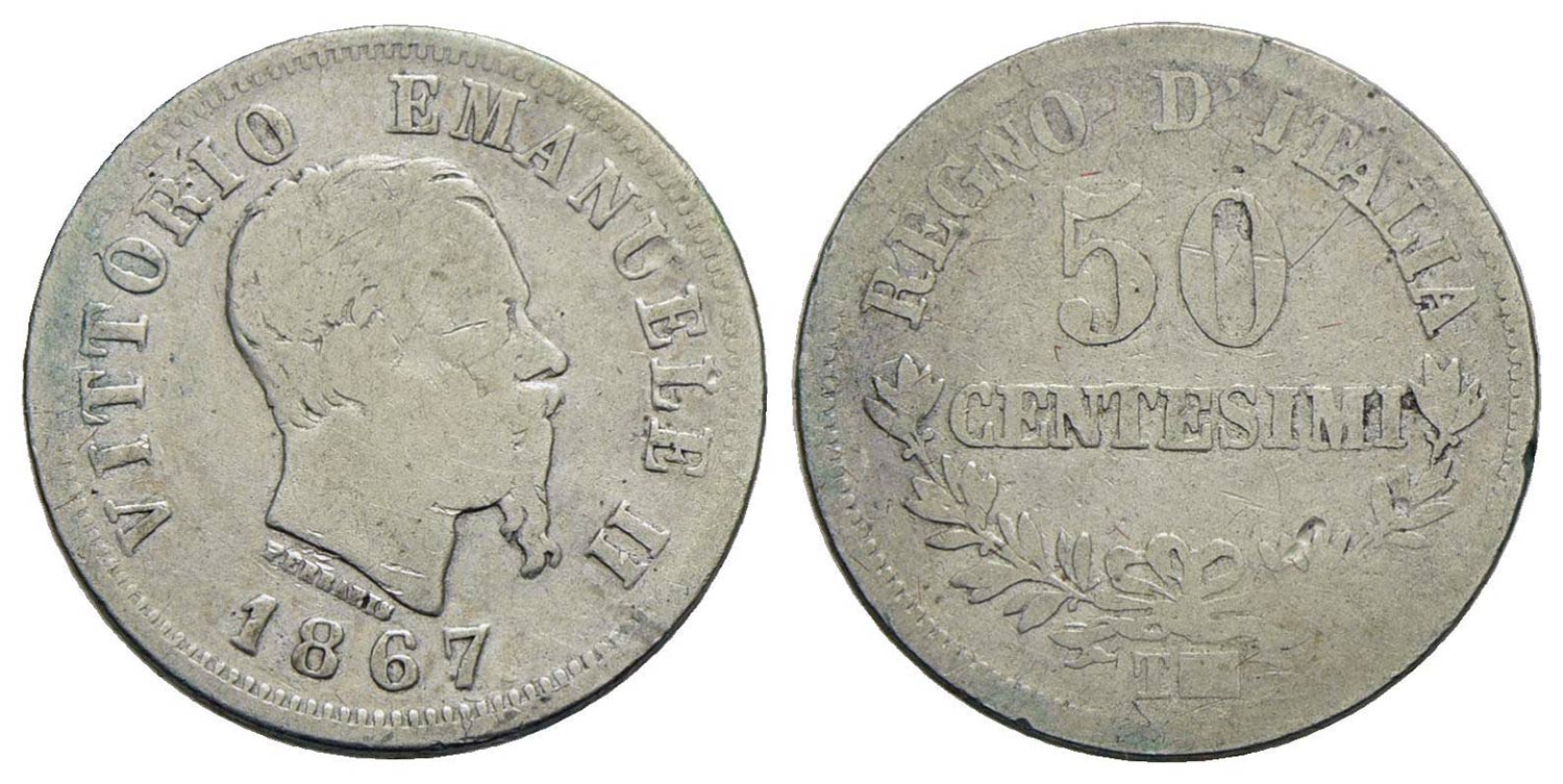 Vittorio Emanuele II Re d'Italia (1861-1878) - 50 Centesimi - 1867 T Valore - AG RR Pag. 533; Mont.