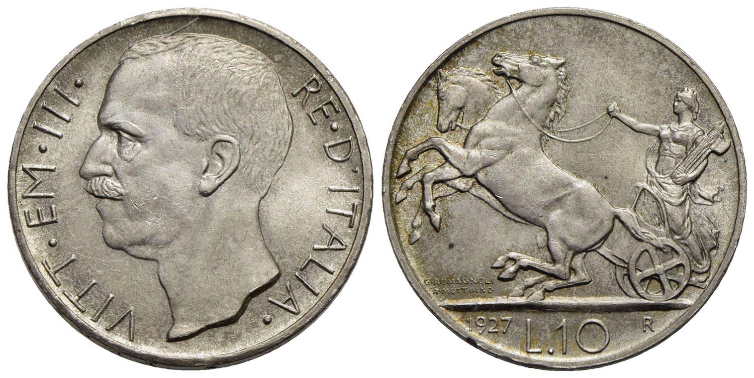 Vittorio Emanuele III (1900-1943) - 10 Lire - 1927 ** Biga - AG Pag. 692a; Mont. 90 Segnetti di cont