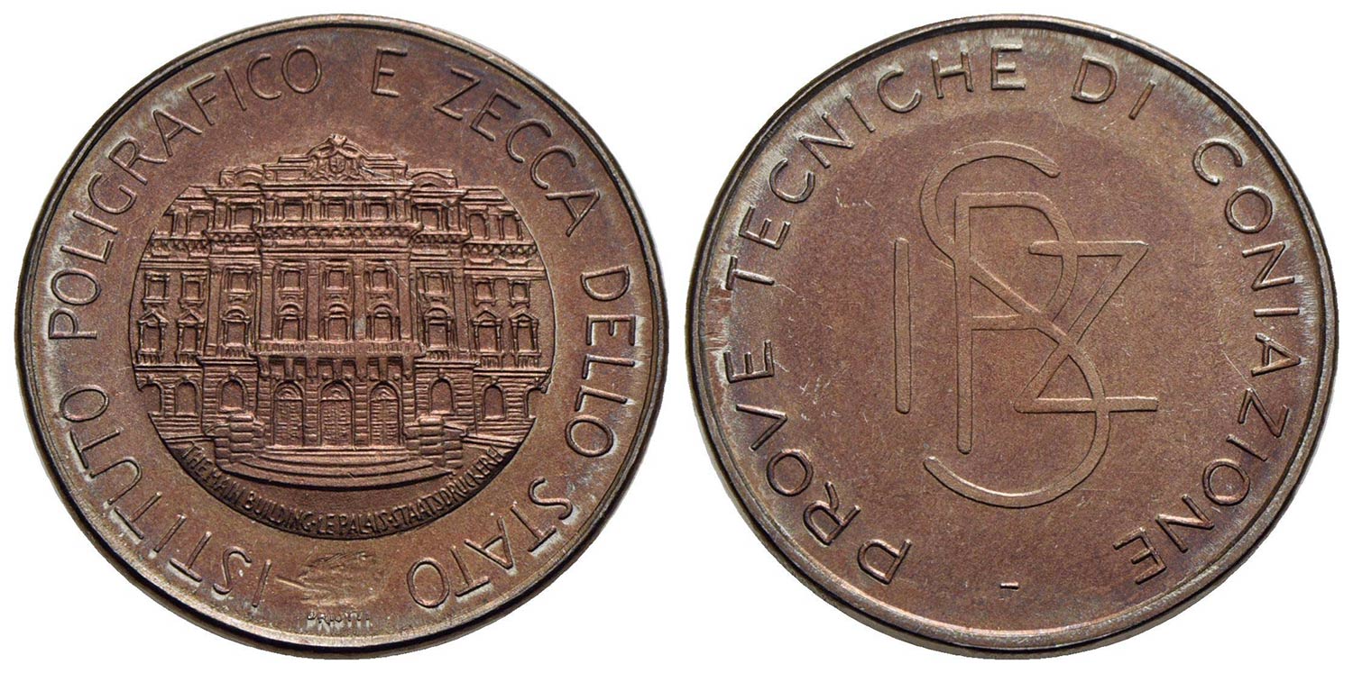 Repubblica Italiana (emissioni in lire) (1946-2001) - 500 Lire - PROVE TECNICHE DI CONIAZIONE, al centro IPZS - R/ ISTITUTO POLIGRAFICO E ZECCA DELLO STATO; al centro l'edificio della Zecca di Stato - (CU-NI g. 6,43) RRRRR Att. PT 26 mm. 25,8 Abrasione in basso - Questo esemplare, a differenza degli altri censiti (asta Montenegro € 3960 e asta Nomisma € 3600), presenta il bordo rigato e liscio come le 500 lire destinate alla circolazione