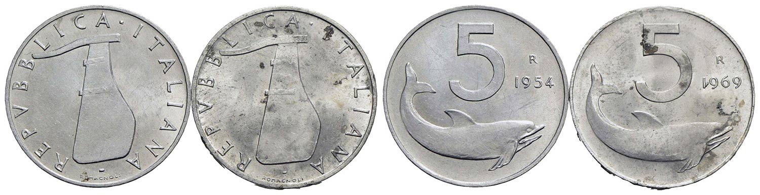 Repubblica Italiana (emissioni in lire) (1946-2001) - 5 Lire - 1969 - IT NC Mont. 15 1 della data rovesciato tracce di ossidazione, assieme a 5 L. 1954 (SPL-FDC) - Lotto di due monete