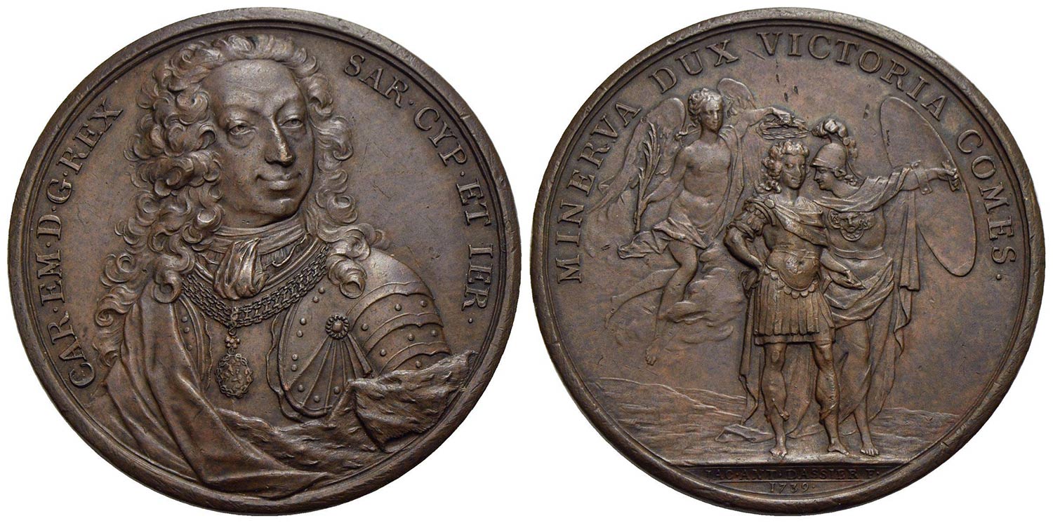 SAVOIA - Carlo Emanuele III (1730-1773) - Medaglia - 1739 - Busto corazzato frontale - R/ Il Re incoronato dalla Vittorie e difeso da Minerva Opus: Dassier Ø: 54 mm. - (AE g. 72,6) U. di S. 17 Segnetti al R/