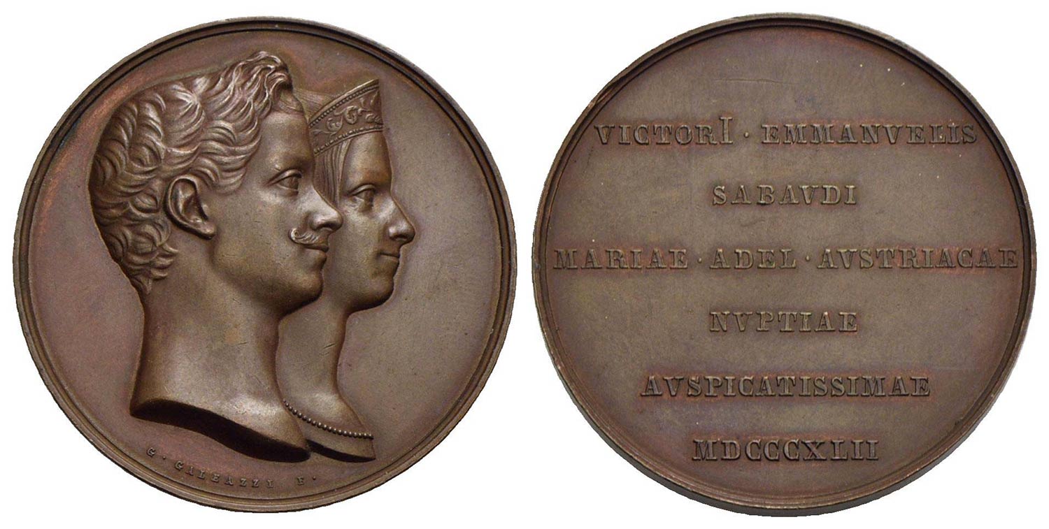 SAVOIA - Carlo Alberto (1831-1849) - Medaglia - 1842 - Nozze di Vittorio Emanuele II (poi Re d'Italia) con Maria Adelaide - Busti accollati a d. - R/ Scritta Opus: Galeazzi Ø: 44 mm. - (AE g. 49,7) R Martini 1713; Johnson 2185