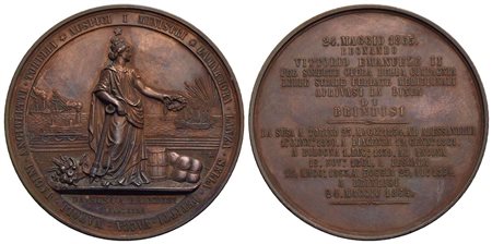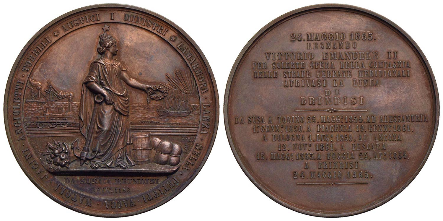 SAVOIA - Vittorio Emanuele II Re d'Italia (1861-1878) - Medaglia - 1865 - Inaugurazione della linea ferroviaria Susa - Brindisi - Allegoria - R/ Scritte Opus: Canzani Ø: 70 mm. - (AE g. 172) RR Martini 1794