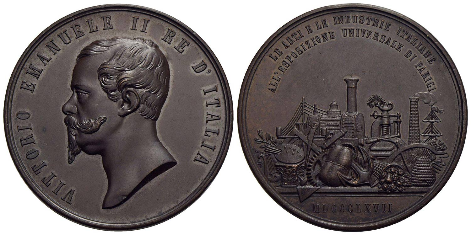 SAVOIA - Vittorio Emanuele II Re d'Italia (1861-1878) - Medaglia - 1867 - Esposizione di Parigi - Arti e industrie italiane - Testa a s. - R/ Oggetti e attrezzi inerenti alle industrie e alle arti italiane Ø: 56 mm. - (AE g. 68,8)