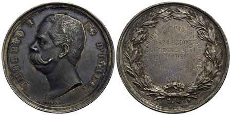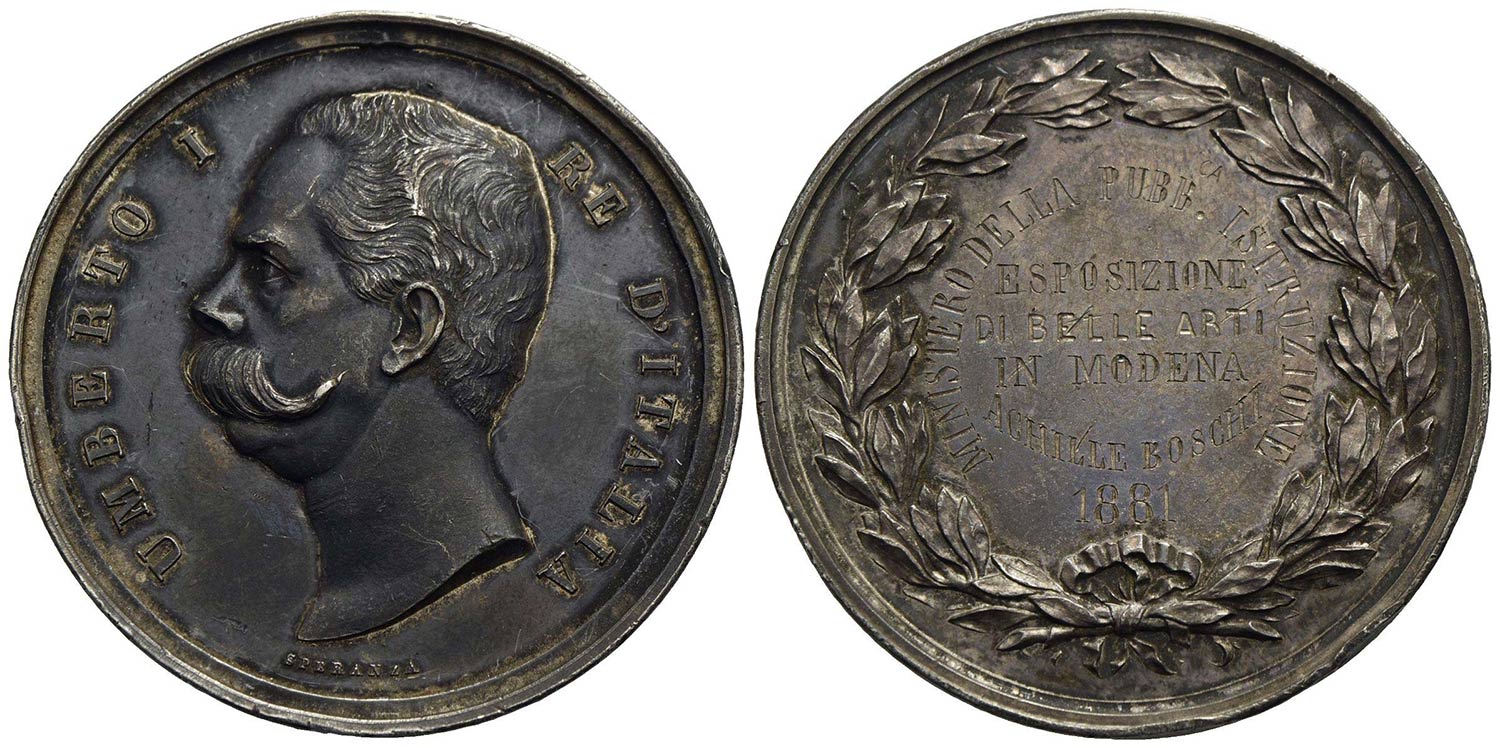 SAVOIA - Umberto I (1878-1900) - Medaglia - 1881 - Esposizione Belle Arti Modena - Testa a s. - R/ Scritta entro corona d'alloro Opus: Speranza Ø: 46 mm. - (AG g. 49,81) Ministero della Pubb. Istruzione Colpi