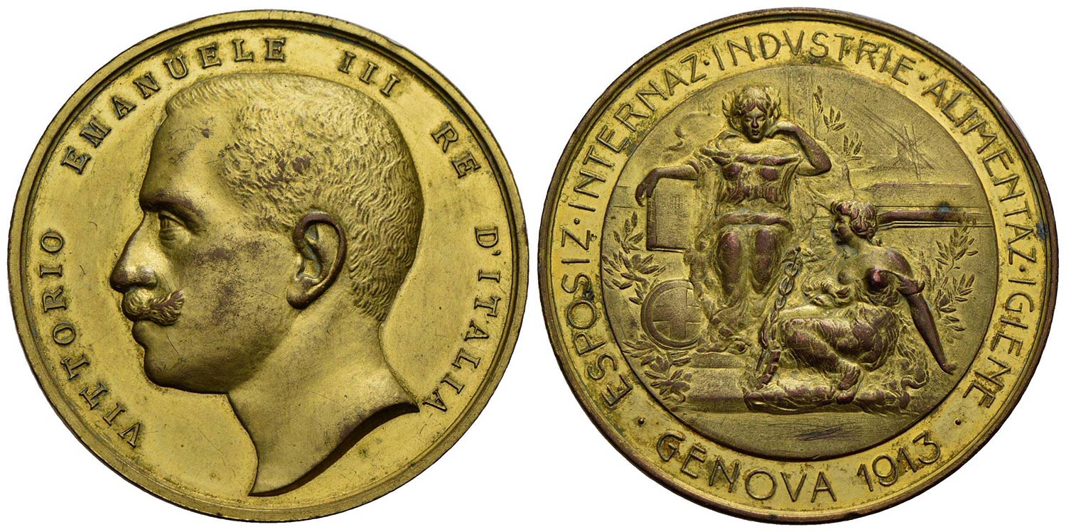 SAVOIA - Vittorio Emanuele III (1900-1943) - Medaglia - 1913 - Esposizione Internazionale Industrie alimentari ed igiene di Genova - Testa di a s. - R/ Scena allegorica Ø: 55 mm. - (AE dorato g. 64,8) Colpetto