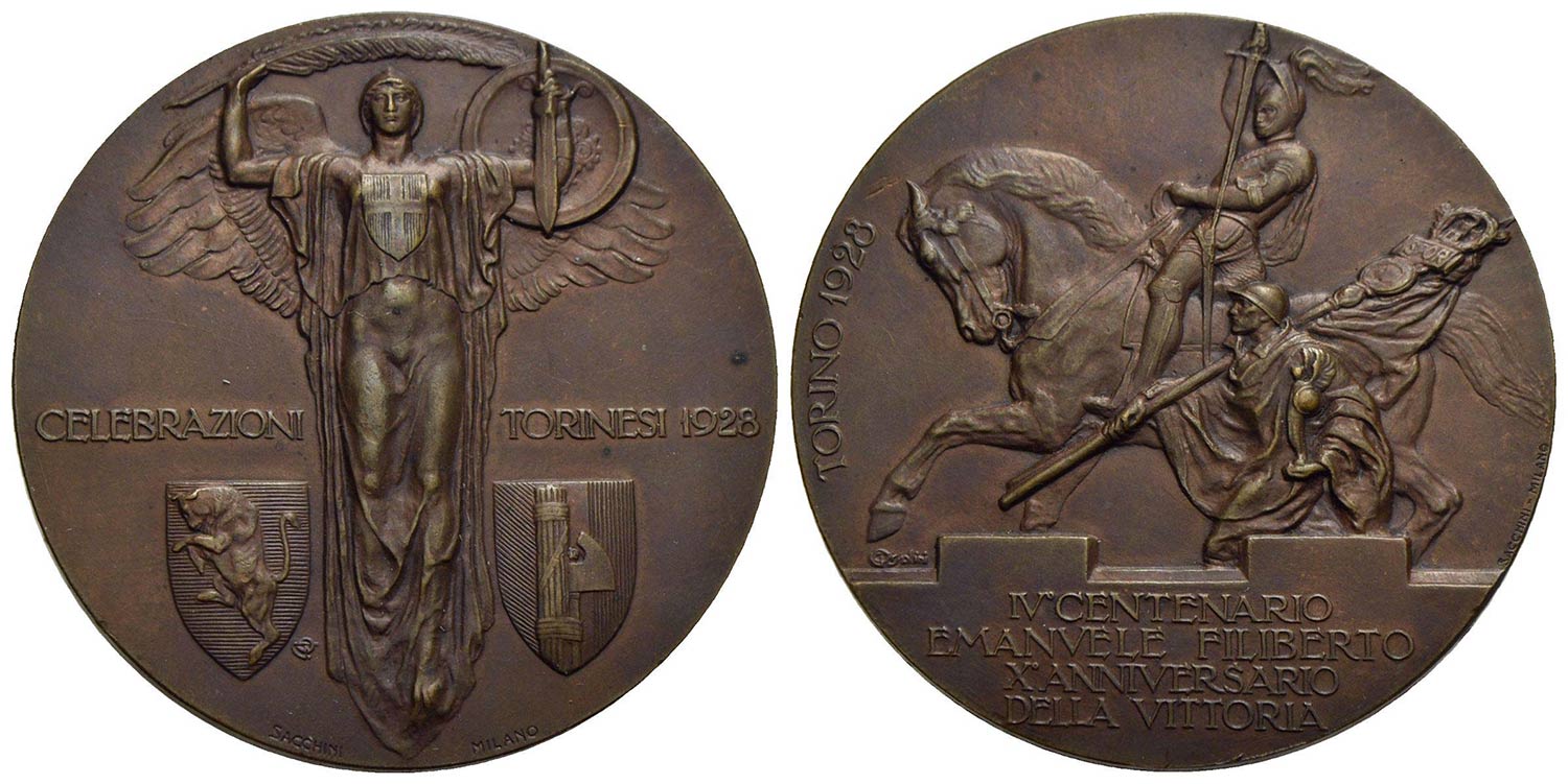 SAVOIA - Vittorio Emanuele III (1900-1943) - Medaglia - 1928 - Celebrazioni torinesi IV centenario nascita Emanuele Filiberto - L'Italia di fronte con palma, gladio e scudo - R/ Monumento equestre a Emanuele Filiberto Opus: Sacchini Ø: 50 mm. - (AE g. 52,9) R