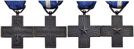 SAVOIA - Vittorio Emanuele III (1900-1943) - Croce - Al merito di guerra Ø: 38 mm. - AE Con nastrino bianco blu Assieme a croce Al valore militare - Lotto di due croci