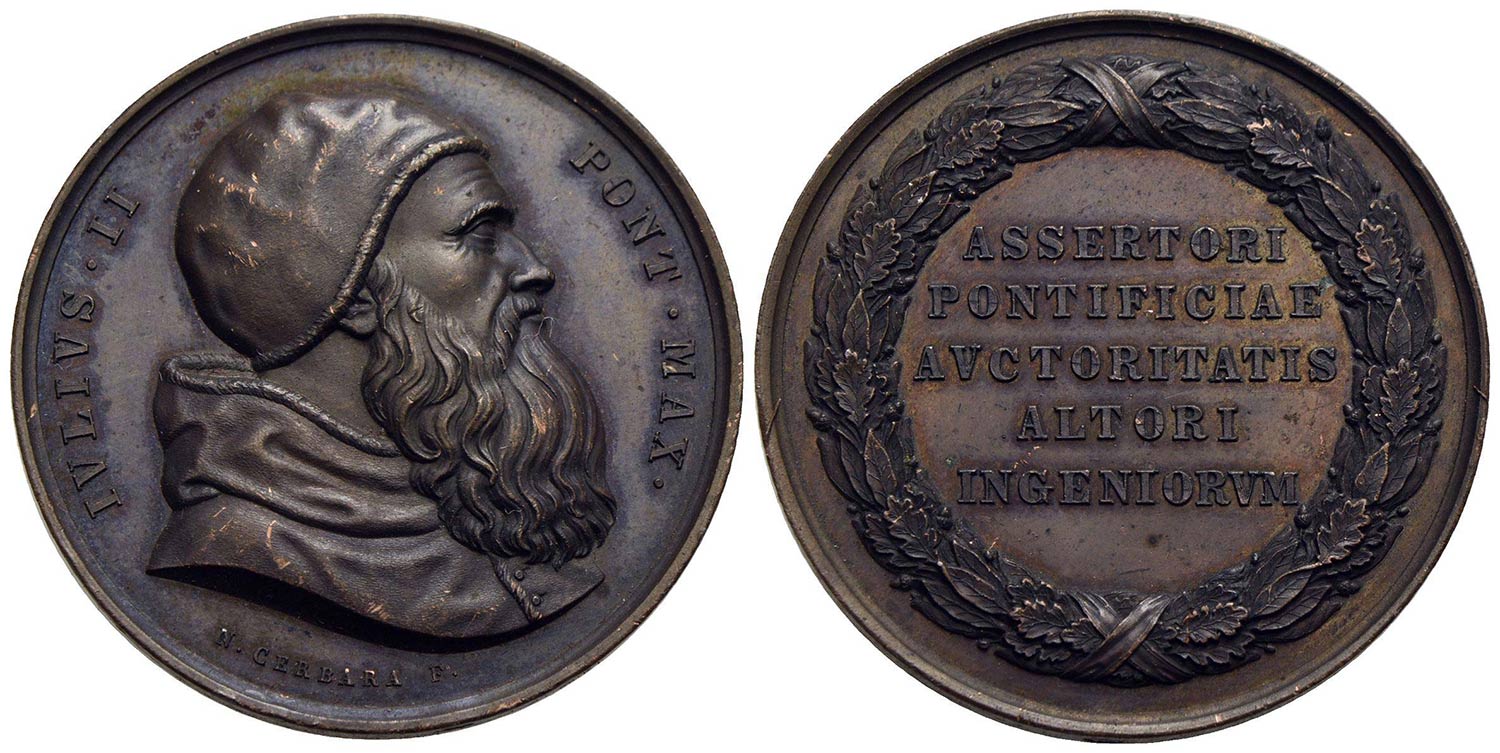 PAPALI - Giulio II (1503-1513) - Medaglia - Busto a d. - R/ Assertori pontificiae auctoritatis altori ingegnorum, entro corona d'alloro Opus: Cerbara Ø: 42 mm. - (AE g. 37,9) RR Mod. 225