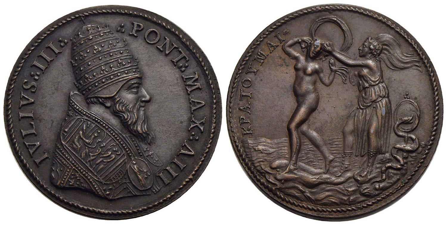 PAPALI - Giulio III (1550-1555) - Medaglia - A. III - Busto con triregno e piviale a d. - R/ Annona in piedi a s.con statuetta della fortuna e cornucopia, cesto con spighe e timone Ø: 33 mm. - (AE g. 17,7) Mod. 385