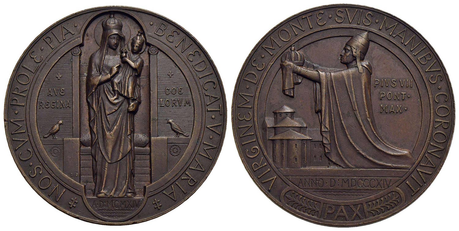 PAPALI - Pio VIII (1829-1830) - Medaglia - 1914 - Incoronazione dell'Assunta - La Madonna in piedi di fronte col Bambino - R/ Pio VII, con triregno e piviale, genuflesso a s., regge una corona sulla Badia del monte di Cesena Opus: Cappuccio Ø: 47 mm. - Patr. 72 (AE g. 50,2)Medaglia emessa nel 1914 dallo Stabilimento Stefano Johnson di Milano, per celebrare il centenario dell'Incoronazione della Madonna dell'Assunta nel Tempio di Santa Maria del Monte in Cesena