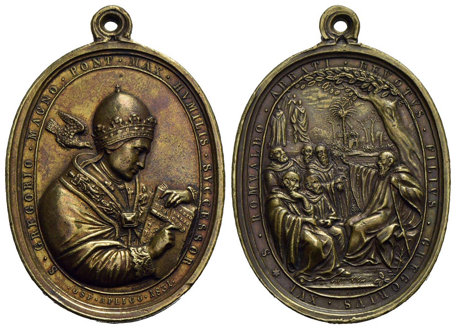 PAPALI - Gregorio XVI (1831-1846) - Medaglia - 1831 - Ospizio Aplico - Busto a d. scrivente - R/ San Romualdo seduto a s. predica a cinque discepoli Opus: Cerbara - (AE dorato g. 65,7) R Patr. 9 Ovale mm 47 x 61